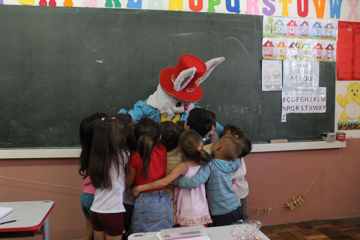 Os colaboradores da NDD levaram o coelhinho da páscoa para passar a manhã de quinta-feira (24/03) na EMEB Oscar Schweitzer, no bairro Guadalajara. Cerca de 120 crianças, do berçário até o 5º ano receberam cestinhas de doces.