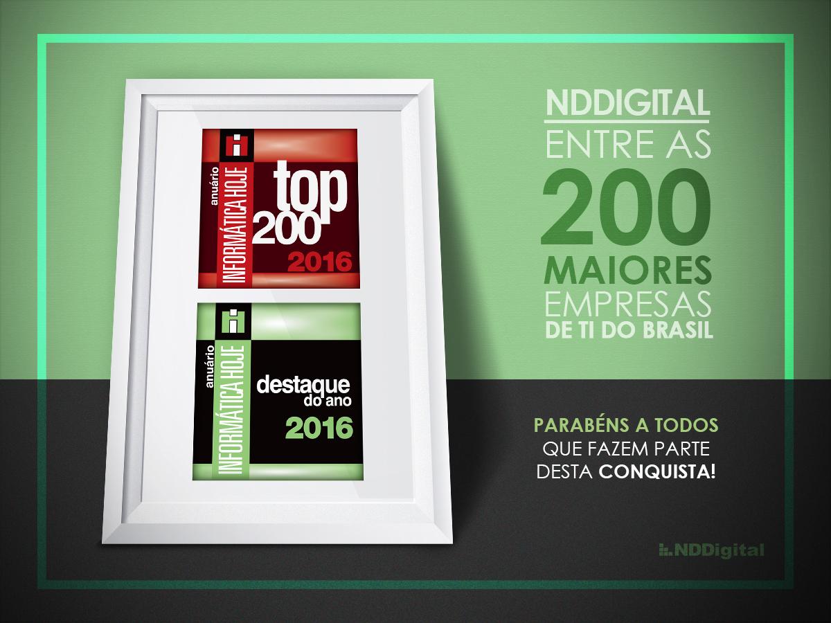 A NDD foi escolhida Destaque do Ano, no segmento de mercado desenvolvedores de software – pequeno porte, no Anuário Informática Hoje 2016. O prêmio, que está na sua 31ª edição, analisa o desempenho de cada uma das empresas do ramo, avaliando informações econômico-financeiros e escolhe destaques em seis grandes blocos de mercado – fabricantes de hardware; desenvolvedores de software; prestadores de serviços; prestadores de serviços/governo; integradores; e canais de comercialização –, que foram divididos nos segmentos Pequeno, Médio e Grande Portes.